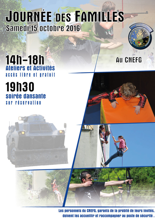 Magnifique succès de la Journée des Familles qui a eu lieu samedi 15 octobre au CNEFG. Cette journée organisée pour permettre aux familles, amis et anciens du CNEFG de se rencontrer, s'est déroulée sous un soleil radieux. Tout le monde a pu profité des nombreuses activités gratuites mises en place sur l'ensemble du CNEFG. (Voir Album photos ci-dessous)